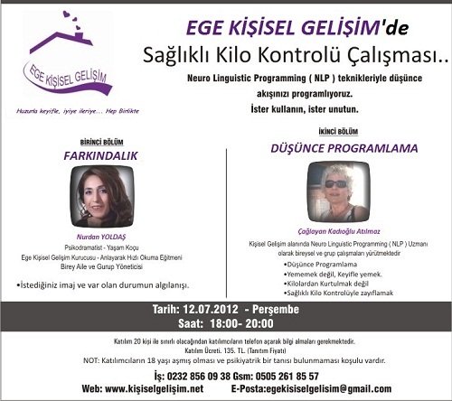 Grup çalışmalarını yürütmek için farklı ruh sağlığı disiplini uzmanlarınca işbirliği yapılacağını duyurmuştuk. Ege Kişisel Gelişim Merkezinde farklı uzmanlarla işbirliği içerisinde sağlıklı kilo kontrolü çalışması bu çerçevede ele aldığımız bir konu. 18 :00- 20 :00 arasında gerçekleştirilecek çalışmaya 18 yaş üstü kadın ve erkekler katılabilecektir. Katılım koşullarımız esnek tutulmakla birlikte psikiyatrik hastalık tanısı almamış olanların katılacağı bir çalışma olarak planlanmıştır.